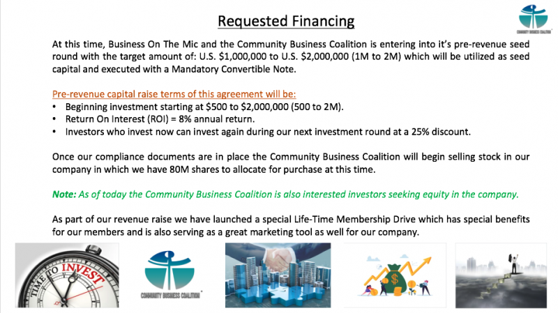 To Invest Now: You may inquire by setting an appointment with Darryl Crutchfield through one of our sales reresentatives or by emailing us at: businessonthemic@gmail.com and placing "Investment Inquiry" in the subject line.